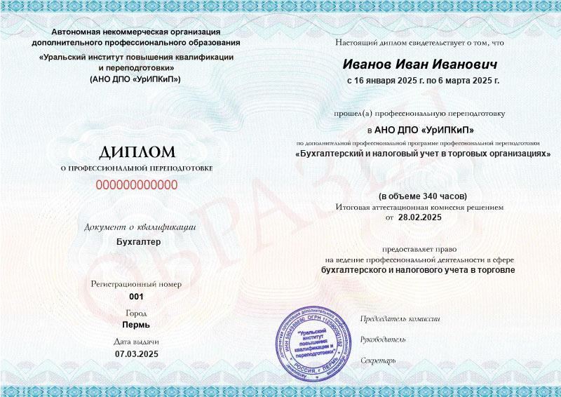 - Образец диплома о профессиональной переподготовке.